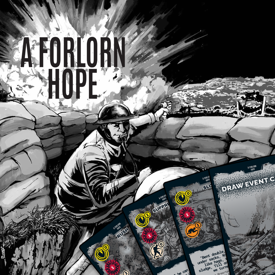 Hermann: A Forlorn Hope is an abstract simulation of six different World War I trench warfare battlefields. It uses a push-your-luck system that allows the player to experience the tension, frustration, and futility of these trench assaults across No Man’s Land. Players will try to push their battalions to victory in six different scenarios: Neuve Chapelle, 1st and 2nd Ypres, Verdun, The Somme, Passchendaele, and the Meuse-Argonne (The Lost Battalion). Each scenario is quite different, with unique elements, mechanics, terrain features, events, and victory conditions.