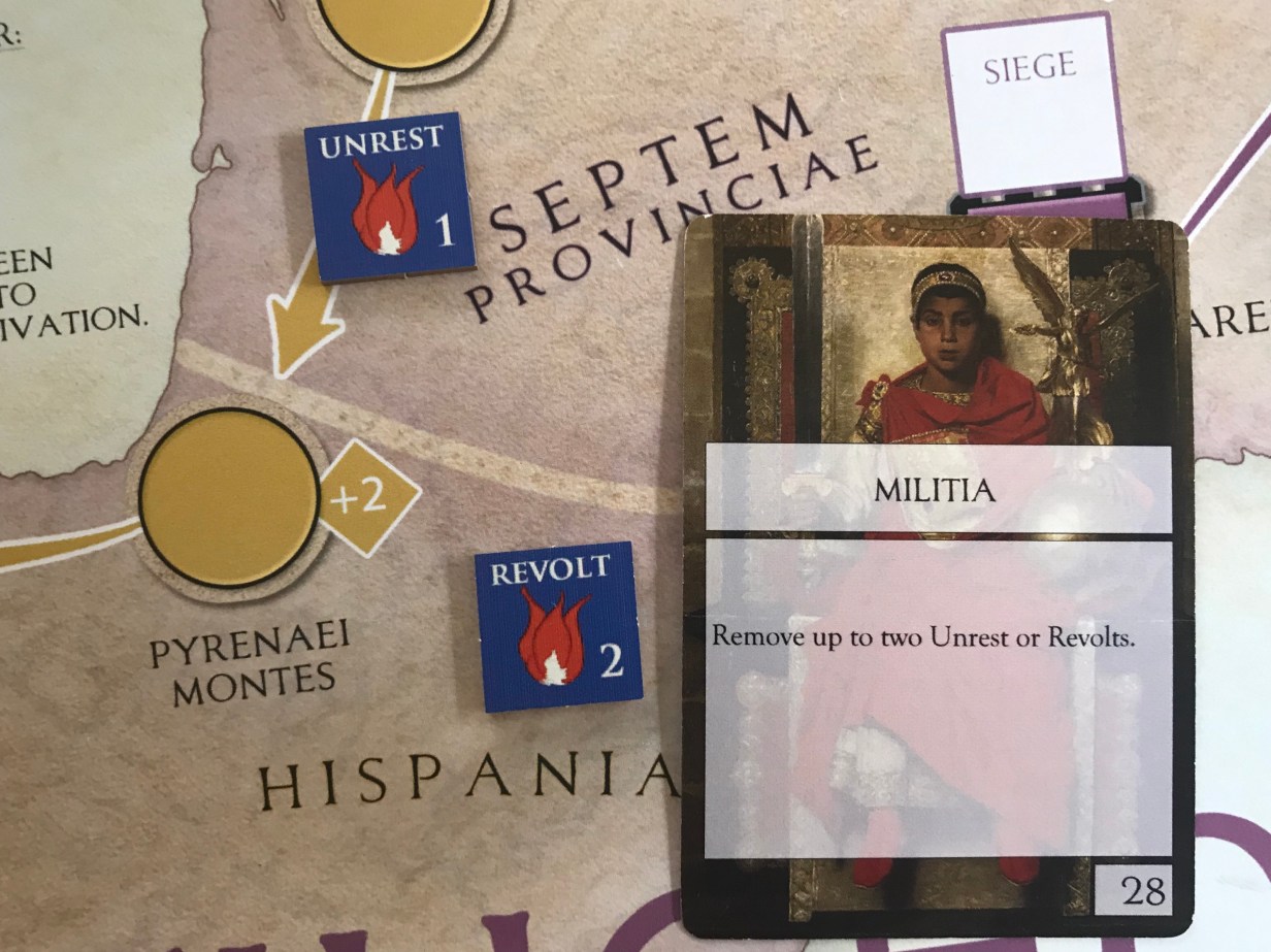 During the game, some cards will put Unrest Markers on the tracks that go through the provinces. These Unrest Markers show how Roman control is weakening, how fear is spreading among people because of threats from rebels, and the problems of defending against barbarian attacks. They act as a growing threat that, if not dealt with, can lead to revolts, which are one of the main ways you lose the game.