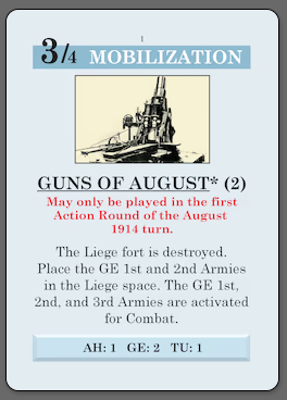 In almost every game, the Central Powers player will start by playing the Guns of August card. This is a very important card for the start of the game. It lets the Central Powers attack right away with a lot of power. The Guns of August card is a 3/4 Operations card. It is in the Central Powers hand at the very start. It gives them the first move. First, the card destroys the fortress at Liège. Then, it gives a big boost to mobilization. It moves two German Army counters from where they start. This includes the German 1st and 2nd Armies. It activates them to attack. It also activates the German 3rd Army, which starts in Koblenz.