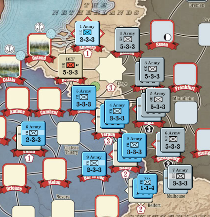 This gives the Central Powers player two choices for the first attack. They can attack the British Expeditionary Force in Brussels. Or, they can attack the French 5th Army in Sedan. The card lets the Central Powers destroy Liège, move armies forward, and attack immediately. In my opinion, the British Expeditionary Force (BEF) is the best target. This unit cannot be replaced. If you remove it, the path to the fortress at Antwerp opens up.