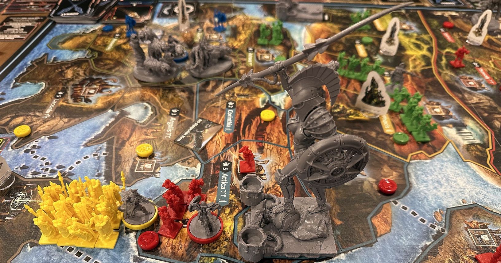 Kuba G był grzeczny w zeszłym roku – docenił to Św. Mikołaj, który przyniósł mu pod choinkę kilka olbrzymich pudeł. A w nich – Lords of Hellas od PHALANX (ewidentnie, ten wyjazd jest pod szyldem tego wydawnictwa patrząc na ogrywane tytuły). Ta przepiękna gra trafiła na “męski stoliczek” i umożliwiła spędzenie nam 2-3 godzin na ciekawej i urozmaiconej rozgrywce. Żeby nie być gołosłownym – Łukasz próbował wygrać przez świątynie, ja przez zabijanie potworów (brakowało mi jednego trafienia do zwycięstwa), Jarek przez kontrole regionów (udało się go powstrzymać) i monument (tu już się nie udało), a Kuba przeszkadzał gdzie się da. Całkiem pozytywne przeżycie.
