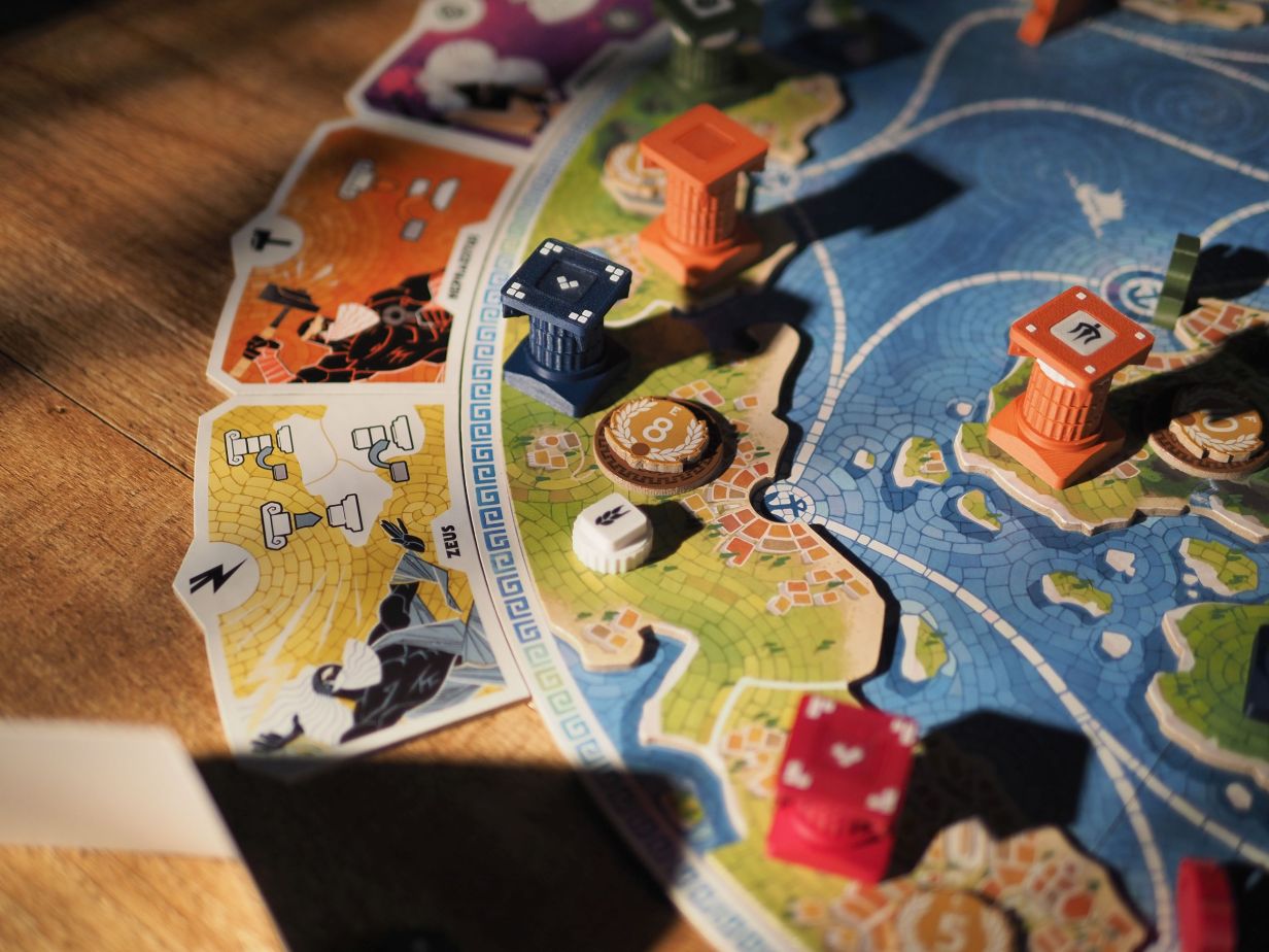 Michal: ***How do players determine victory in For the Gods*? What is our goal?David: Players are trying to score the most points by building the tallest towers across the islands. At the end of the game, each region is evaluated: the tallest tower claims the region tile for points, and in three- or four-player games the second-tallest tower can earn an additional medal.