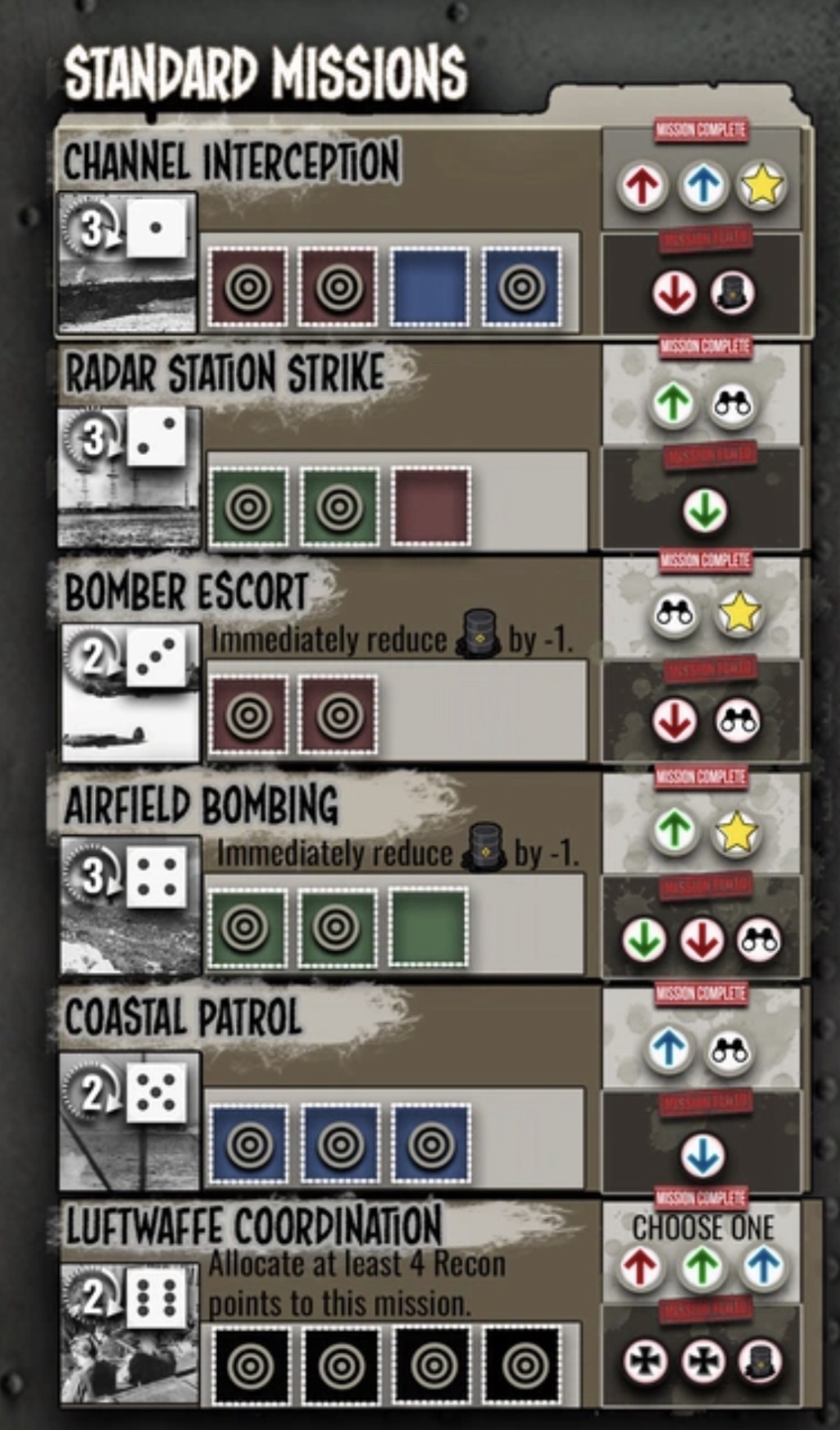 Martin: The goal is all about how well you managed your plane attacks to finish as many important missions as possible before time runs out. At the end of a tough 12-turn campaign, it really comes down to how much you pushed aggressive attacks versus how much you focused on repairing and getting planes ready, and dealing with the limited supplies of WWII Germany. At the end of the game, you add up all the points you earned from finishing missions and any bonuses from keeping the Campaign dice low enough. Then you check that total against the Victory chart on your game sheet. Each campaign has its own required totals. The difference between a ‘Victory’ and a ‘Brilliant Victory’ is just having a few extra points to upgrade your Fliegerkorps at the end of the campaign (and, of course, bragging rights).