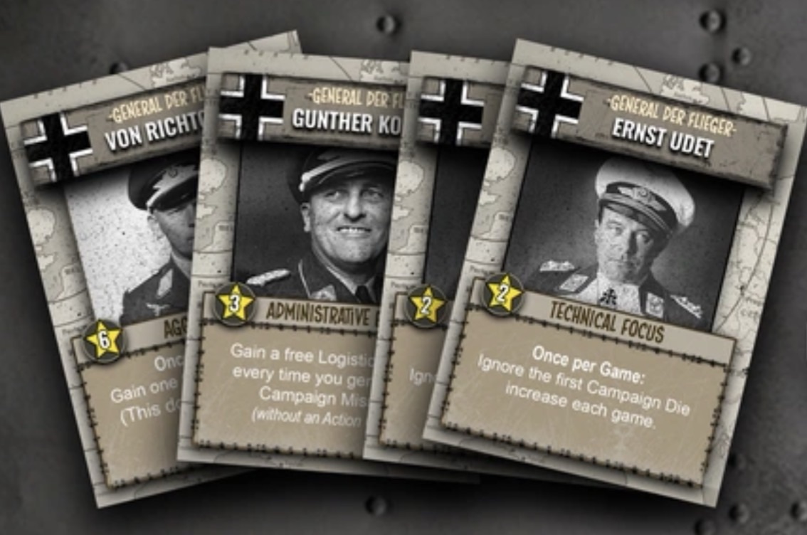 Before each game, you start by choosing a Commander card and paying its VP cost. Commanders simply give you one, but powerful, special ability. A leader who likes to attack, like Richthofen, makes your attacks stronger, while others might help you be more efficient or have more control. Always choose one that fits how you like to play.