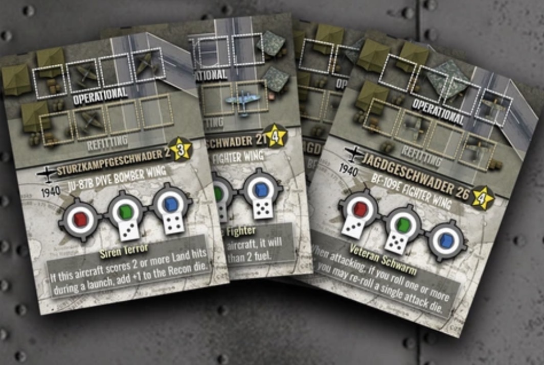 Martin: Aircraft cards are the real stars of Fliegerkorps. They include fighter planes, dive-bombers, recon planes, bombers, or even heavy fighter groups. Each has 2-4 grey cubes to show how strong the groups of planes are. I honestly think one of my best ideas for the game was to have a little airfield picture on the top half of each aircraft card. This picture is split into an ‘Operational Row’ for planes ready to fly and a ‘Refit Row’ just below it, for damaged planes that are being fixed or getting parts.