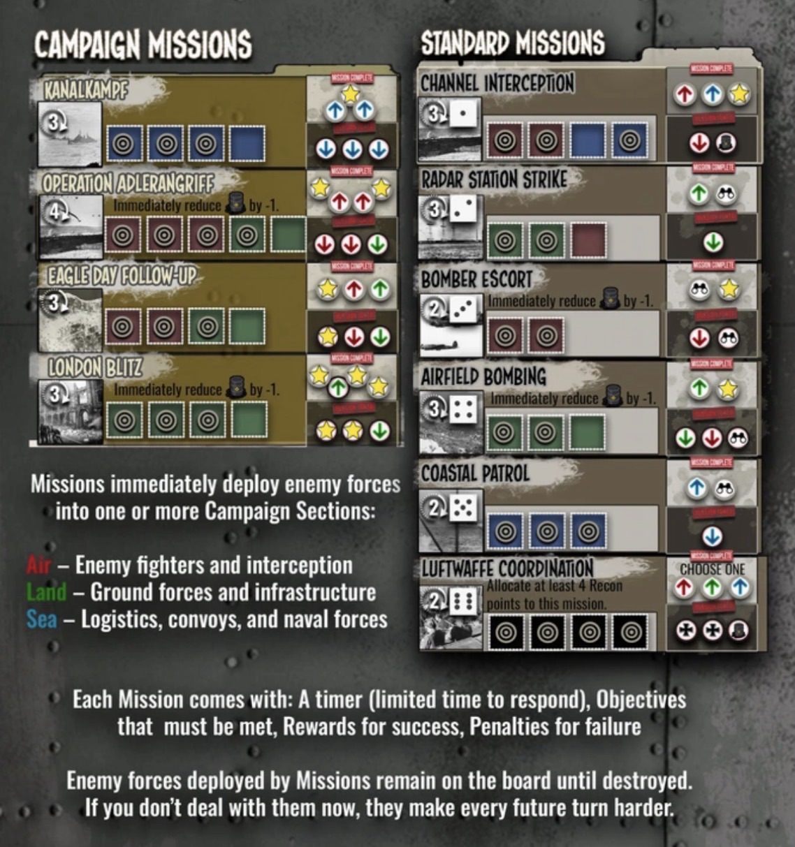 The middle part is mostly taken up by the three Campaign Sections (Air: red fighters, Land: green anti-aircraft/ground forces, Sea: blue supply ships and naval forces). The top right shows the tables for Standard Missions and Campaign Missions. Finally, the bottom right has the very important Action Boxes.