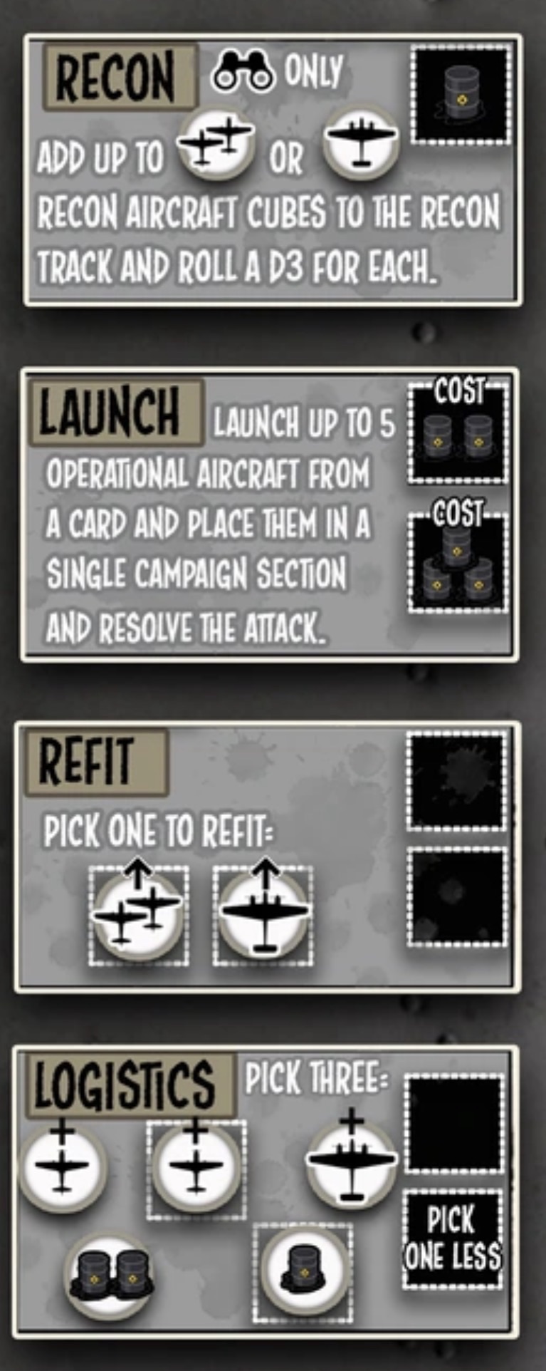 - Launch/Attack: Send planes from the ‘Operational Row’ of one Aircraft card to attack a Campaign Section. If you roll successfully, you remove enemy cubes, which can be placed on Mission goals if possible. After the attack, those groups of planes move to the ‘Refit Row.’